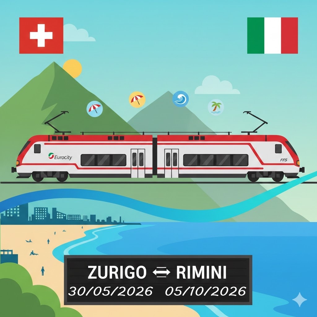 Train direct Zurich-Rimini 2026 : Horaires & Navette Gratuite | Hôtel Rivazzurra*** Rimini. 01 March 2026|News Train Zurich-Rimini du 30 mai au 5 octobre 2026. Des vacances durables. Les vacances en Romagne n’ont jamais été aussi proches. Découvrez la nouvelle liaison Eurocity che reliera quotidiennement la Suisse à Rimini pour l’été 2026. Possibilité de navette gratuite depuis et vers la gare de Rimini. Appelez-nous ou demandez des informations ! 🚌 Navette gratuite! 📅valable pour toute réservation effectuée avant le 30 mai. L’été 2026 marque un tournant pour le tourisme international en Émilie-Romagne. Grâce à la collaboration entre Trenitalia et les Chemins de fer fédéraux suisses (CFF), du 30 mai au 5 octobre 2026, une nouvelle liaison ferroviaire internationale Eurocity reliera directement Zurich HB à Rimini, sans aucun changement. Il s’agit d’une opportunité stratégique pour tous les voyageurs suisses qui souhaitent rejoindre les plages de la Riviera Romagnole dans un confort total, en misant sur une mobilité durable, rapide et de qualité. 🚆 Les Points Forts du Service Période : Tous les jours, du 30 mai au 5 octobre 2026. Zéro Changement : Voyage direct depuis Zurich au cœur de la Riviera. Durabilité : Une manière écologique de voyager entre la Suisse et l’Italie. Confort : Service Eurocity avec des arrêts stratégiques dans les principales villes d’Émilie-Romagne. 🕒 Horaires et Arrêts Le service est structuré pour maximiser le temps de vacances, avec des horaires pratiques aussi bien pour l’aller que pour le retour. Aller : Zurich HB – Rimini (EC 153) Le train part de Zurich le matin, vous permettant d’arriver à l’hôtel à Rimini juste à temps pour le dîner. Départ de Zurich HB : 10h33 Arrêts en Suisse : Zoug, Arth-Goldau, Bellinzone, Lugano, Chiasso. Arrêts en Italie : Côme S. Giovanni, Milan Lambrate, Milan Rogoredo, Plaisance, Parme, Reggio d’Émilie, Modène, Bologne Centrale, Faenza, Forlì, Cesena. Arrivée à Rimini : 18h23 Retour : Rimini – Zurich HB (EC 152) Un départ matinal de la Riviera pour rentrer au cœur de la Suisse en fin d’après-midi. Possibilité de navette gratuite depuis et vers la gare de Rimini. Appelez-nous ou demandez des informations! 🚌 Navette gratuite! 📅valable pour toute réservation effectuée avant le 30 mai. Départ de Rimini : 09h52 Arrêts en Italie : Cesena, Forlì, Faenza, Bologne Centrale, Modène, Reggio d’Émilie, Parme, Plaisance, Milan Rogoredo, Milan Lambrate, Côme S. Giovanni. Arrêts en Suisse : Chiasso, Lugano, Bellinzone, Arth-Goldau, Zoug. Arrivée à Zurich HB : 17h27 Pourquoi choisir le train pour vos vacances à Rivazzurra de Rimini ? En plus de l’avantage d’éviter le trafic autoroutier et les files d’attente au tunnel du Gothard, le nouvel Eurocity vous permet d’admirer des paysages à couper le souffle depuis votre fenêtre, en passant des Alpes suisses aux plaines d’Émilie, jusqu’à atteindre la mer Adriatique. Nous vous attendons à Rivazzurra di Rimini pour un été inoubliable ! Possibilité de navette gratuite depuis et vers la gare de Rimini. Appelez-nous ou demandez des informations ! ❓ Questions Fréquemment Posées (FAQ) Quelle est la durée du trajet en train direct Zurich-Rimini ? Le trajet dure environ 7 heures et 50 minutes. Le départ de Zurich HB est à 10h33 avec une arrivée prévue à Rimini à 18h23, vous permettant de profiter de votre premier dîner sur la Riviera. Le service de navette depuis la gare de Rimini est-il gratuit ? Oui ! Pour faciliter votre arrivée, nous proposons un service de navette gratuite depuis et vers la gare de Rimini pour nos clients. Il suffit de nous contacter à l’avance pour réserver votre transfert. Quand circule le train Eurocity direct pour Rimini en 2026 ? Le service direct Zurich-Rimini est disponible quotidiennement du 30 mai au 5 octobre 2026. C’est la solution idéale pour des vacances d’été durables et sans stress. Quelles sont les principales étapes du train Eurocity en Suisse ? Le train dessert les gares de Zoug, Arth-Goldau, Bellinzone, Lugano et Chiasso avant de traverser la frontière italienne vers Milan et la côte Adriatique. Pourquoi choisir le train plutôt que la voiture pour venir à Rimini ? En choisissant l’Eurocity, vous évitez le trafic du tunnel du Saint-Gothard et les frais de parking. C’est une option de mobilité durable qui vous permet d’admirer les paysages alpins en tout confort.